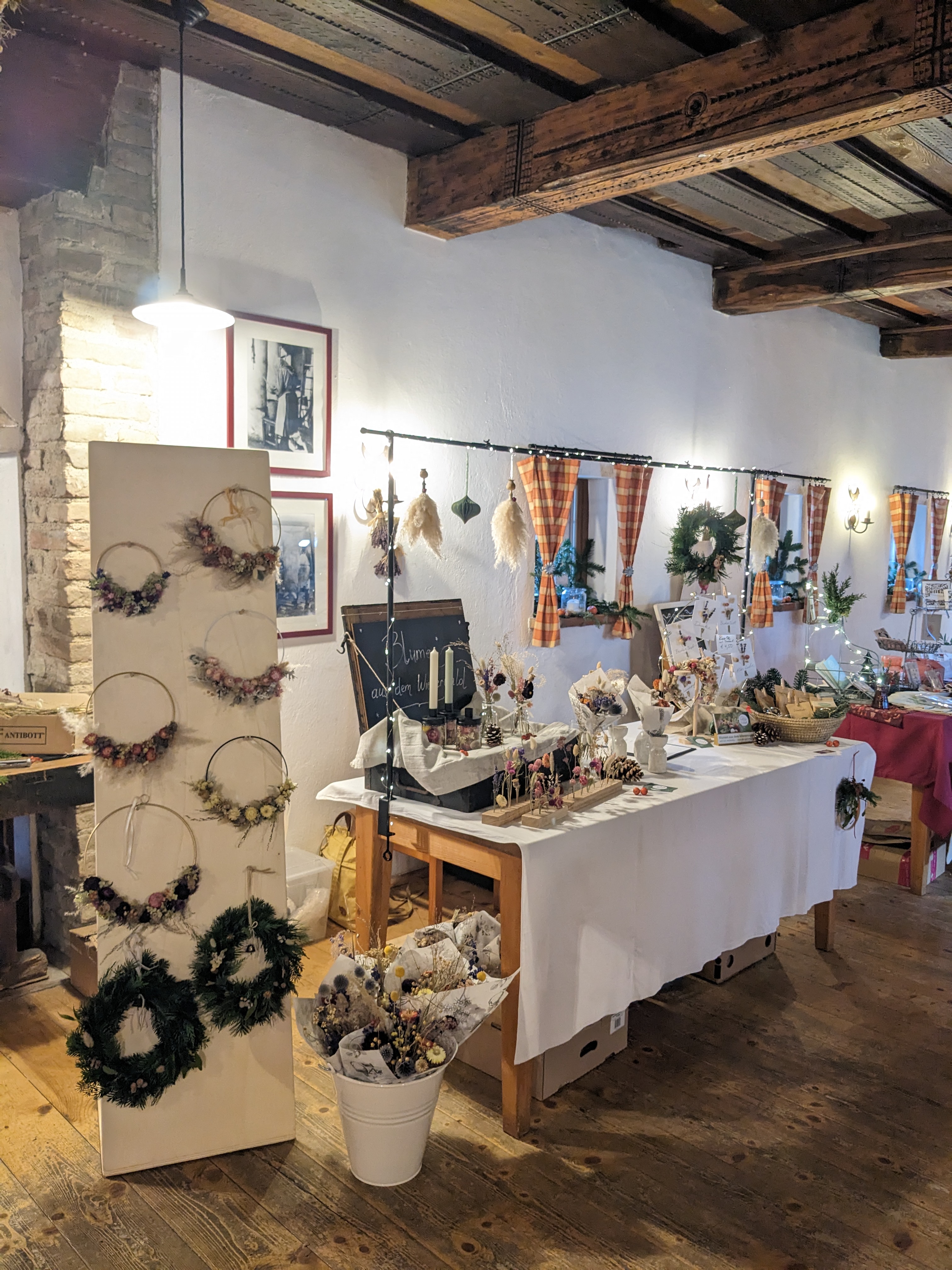 Trockenblumengestaltungen wie Loops, Kränze, Kerzenständer, Holzleisten mit Trockenblumen, etc.