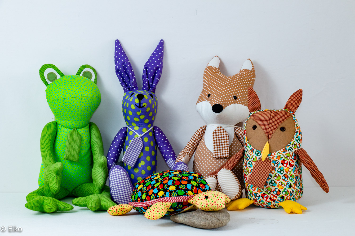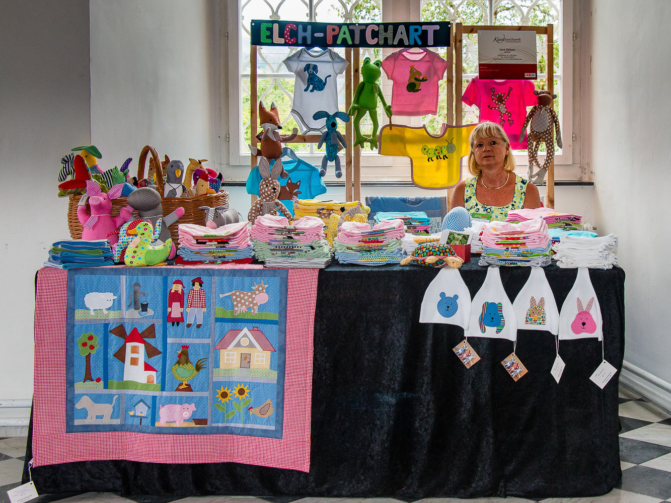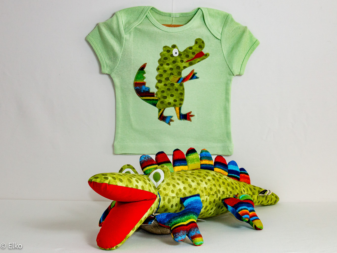 Stofftiere aus bunten Baumwollstoffen, T-Shirts mit Applikationen passend zu den Stofftieren; Stoffbilderbücher, Stoff-Memories, Krabbeldecken.