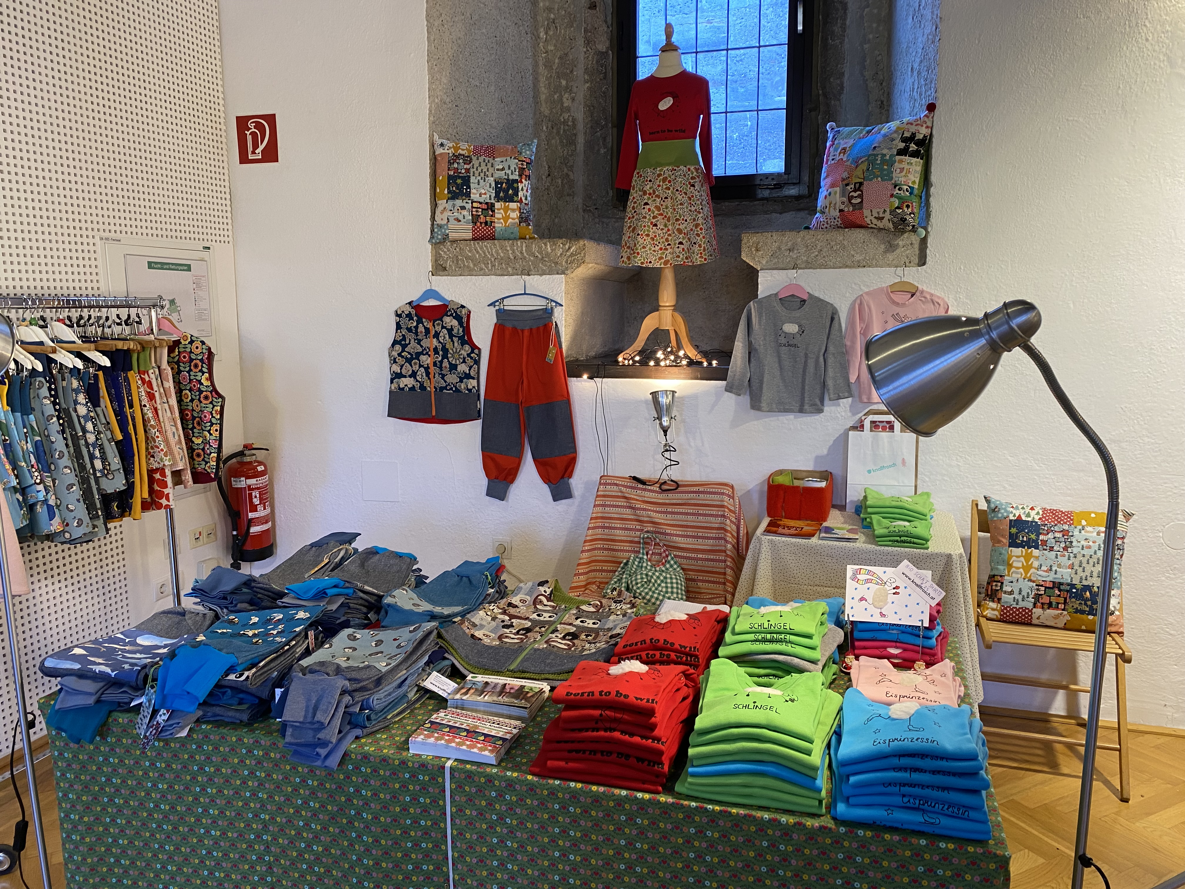 Bunte Kindermode, Shirts mit Schafen, Patchwork Pölster