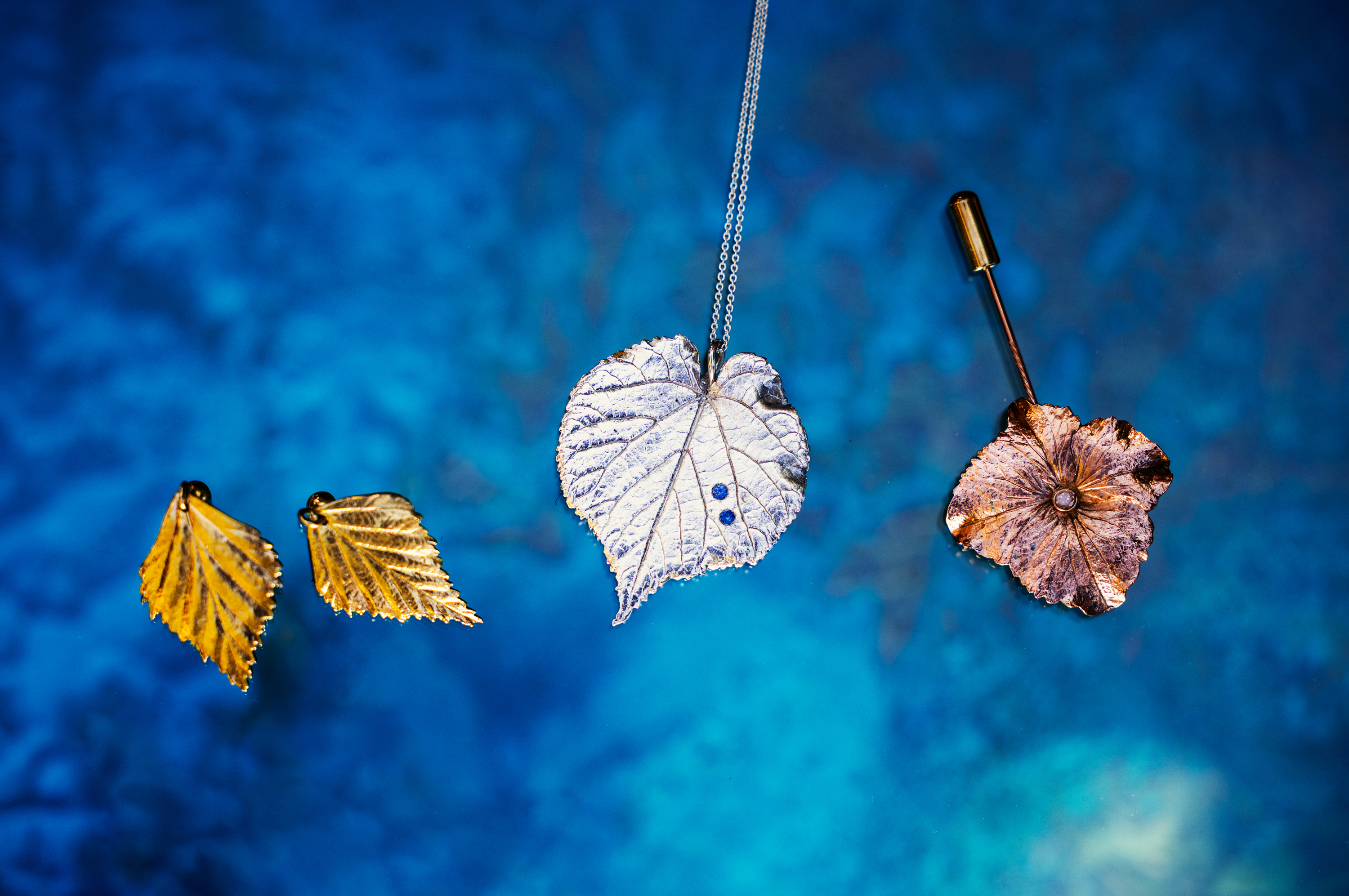 Naturinspirierte Schmuckunikate in Gold und Silber, gefertigt mit traditionellen und modernen Techniken. Blätterschmuck und Mitsuro Hikime. Kunsthandwerk aus Wien-Hietzing.