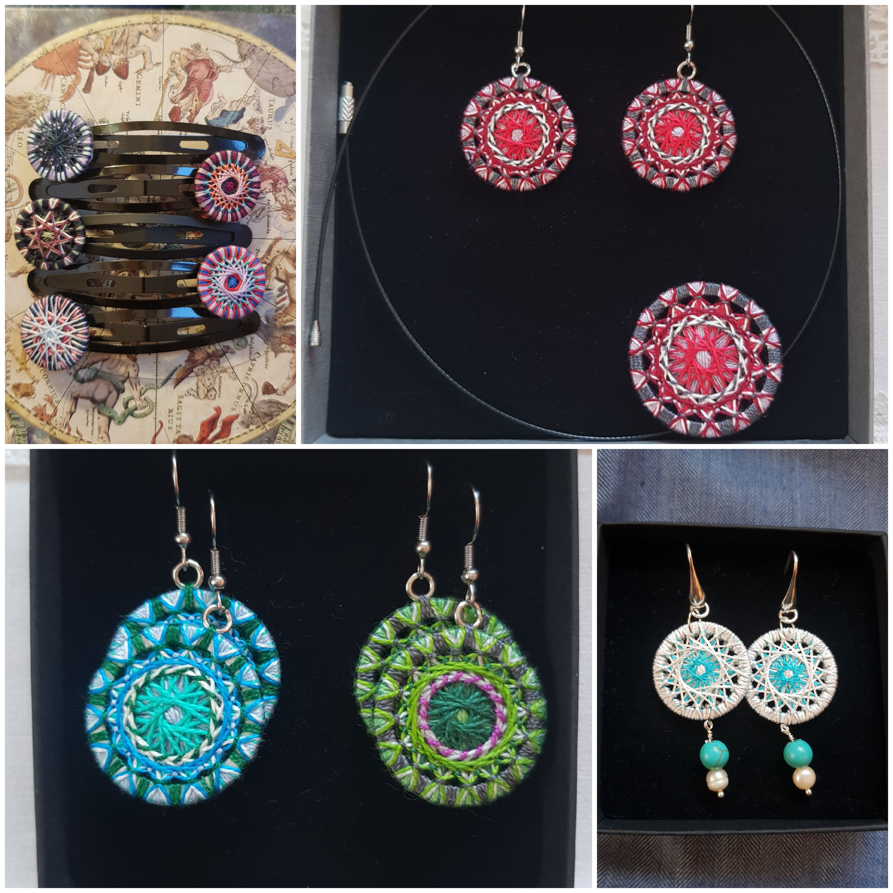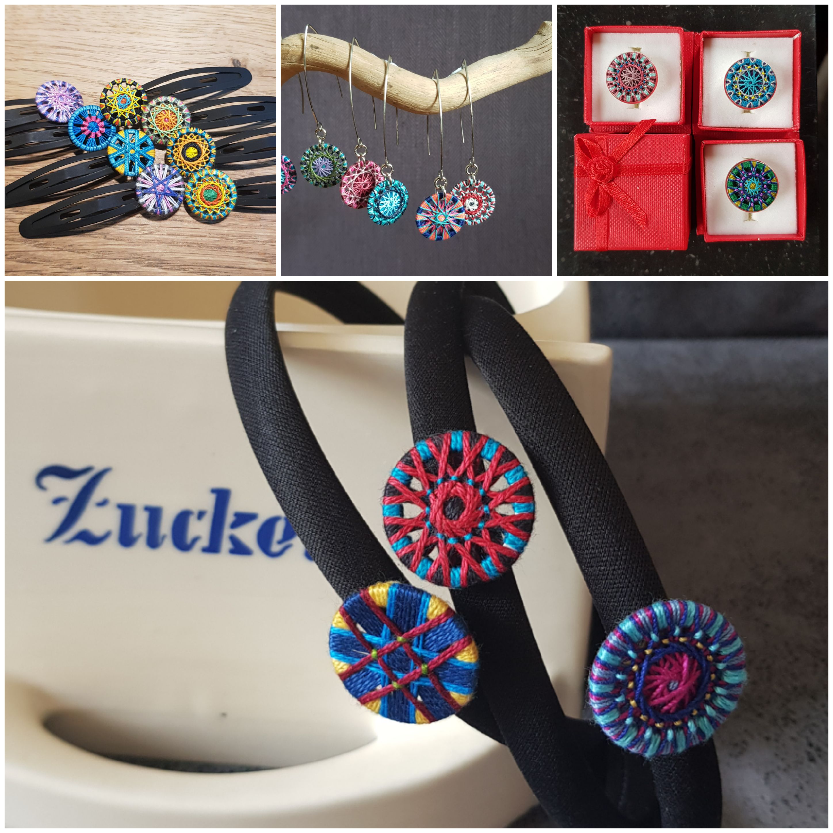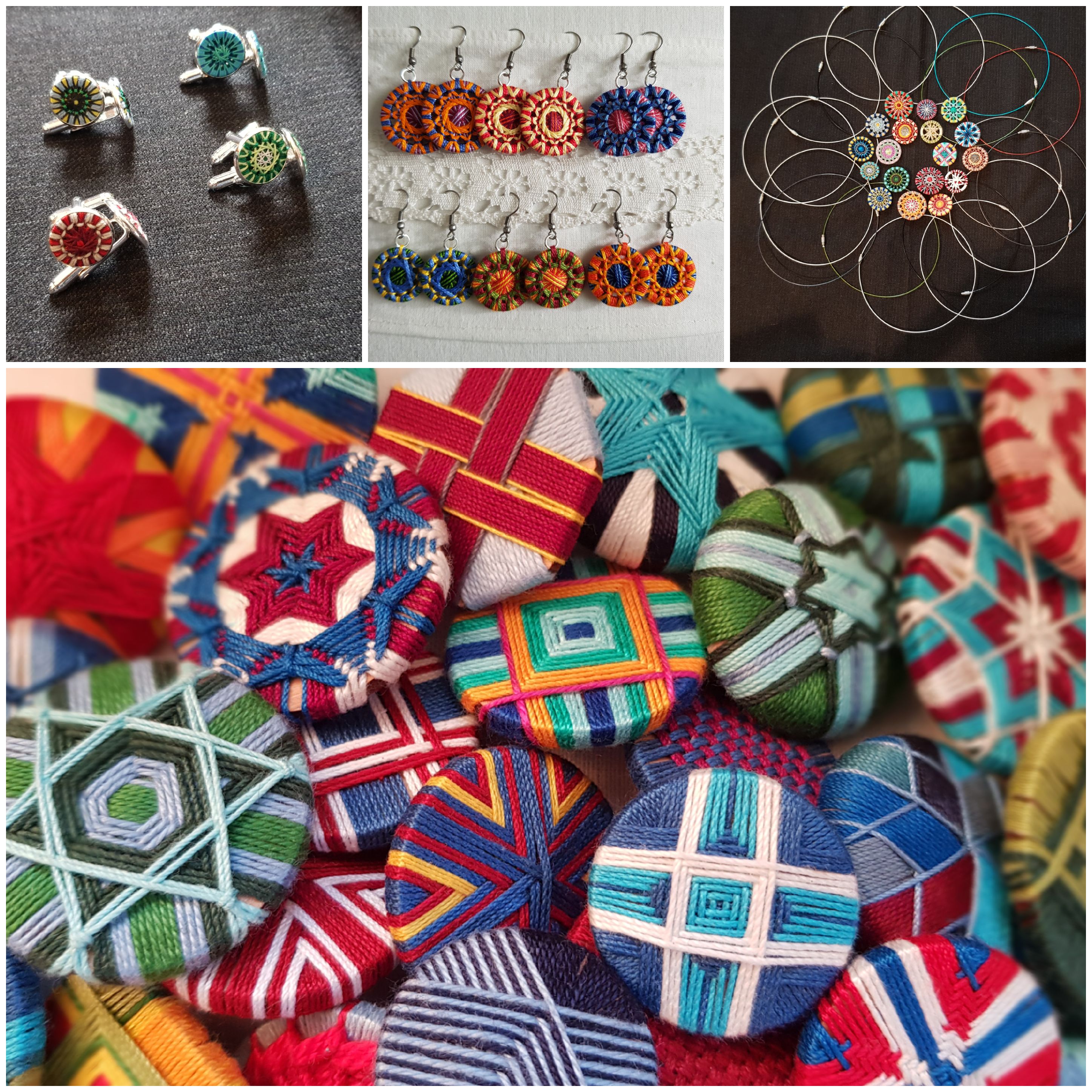 Bunte, kunstvolle Zwirn- und Posamentenknöpfe in groß und klein, in vielen unterschiedlichen Formen. Traditionelles Handwerk teilweise neu interpretiert. Die Knöpfe werden als Knöpfe angeboten, aber auch weiterverarbeitet zu Ohrringen, Haarschmuck, Manschettenknöpfen und Nadelkissen.