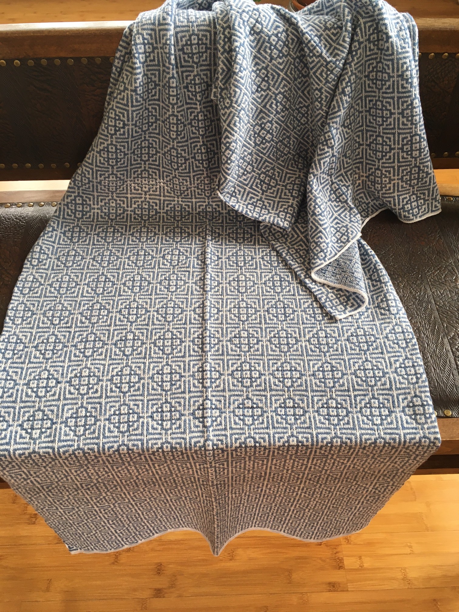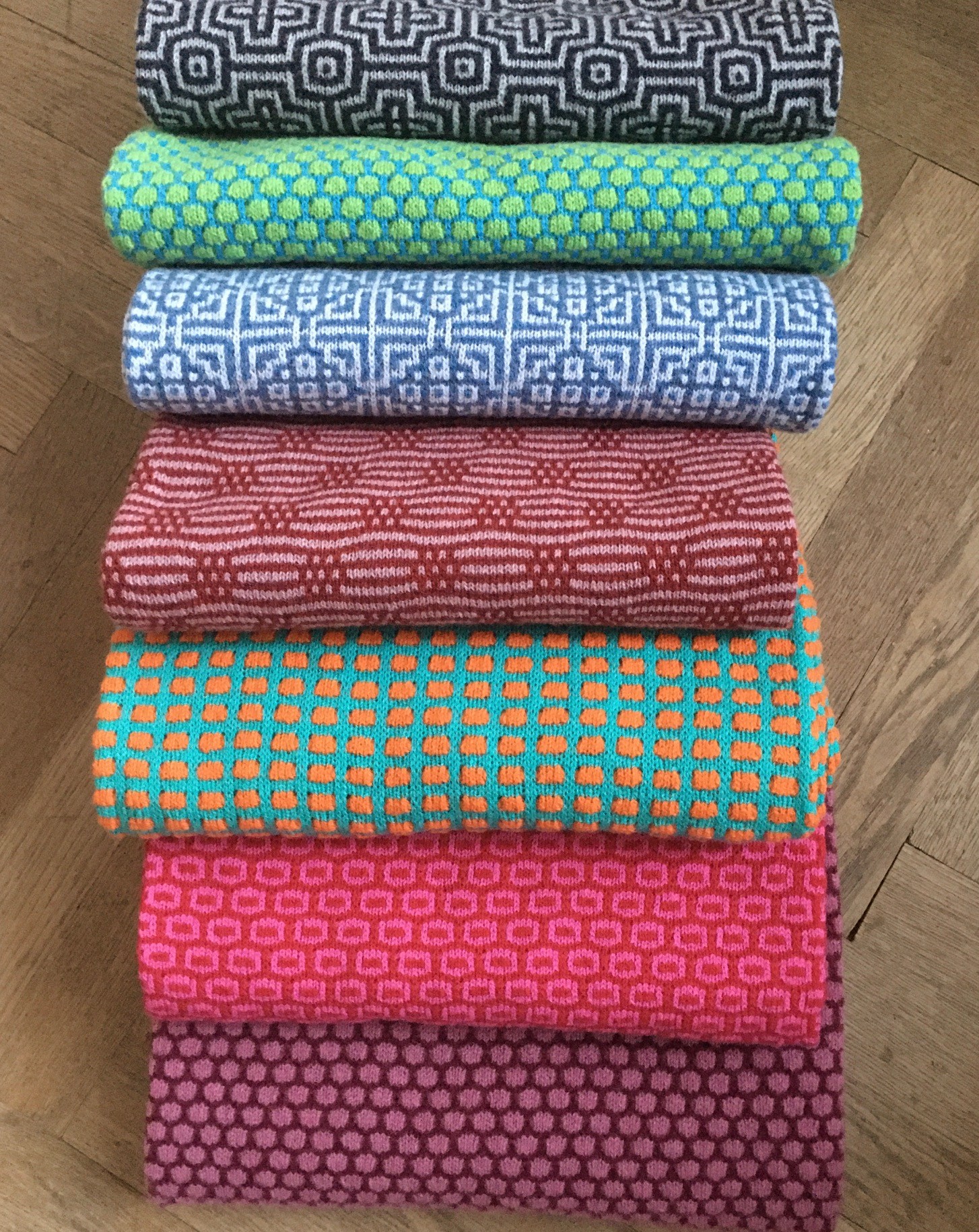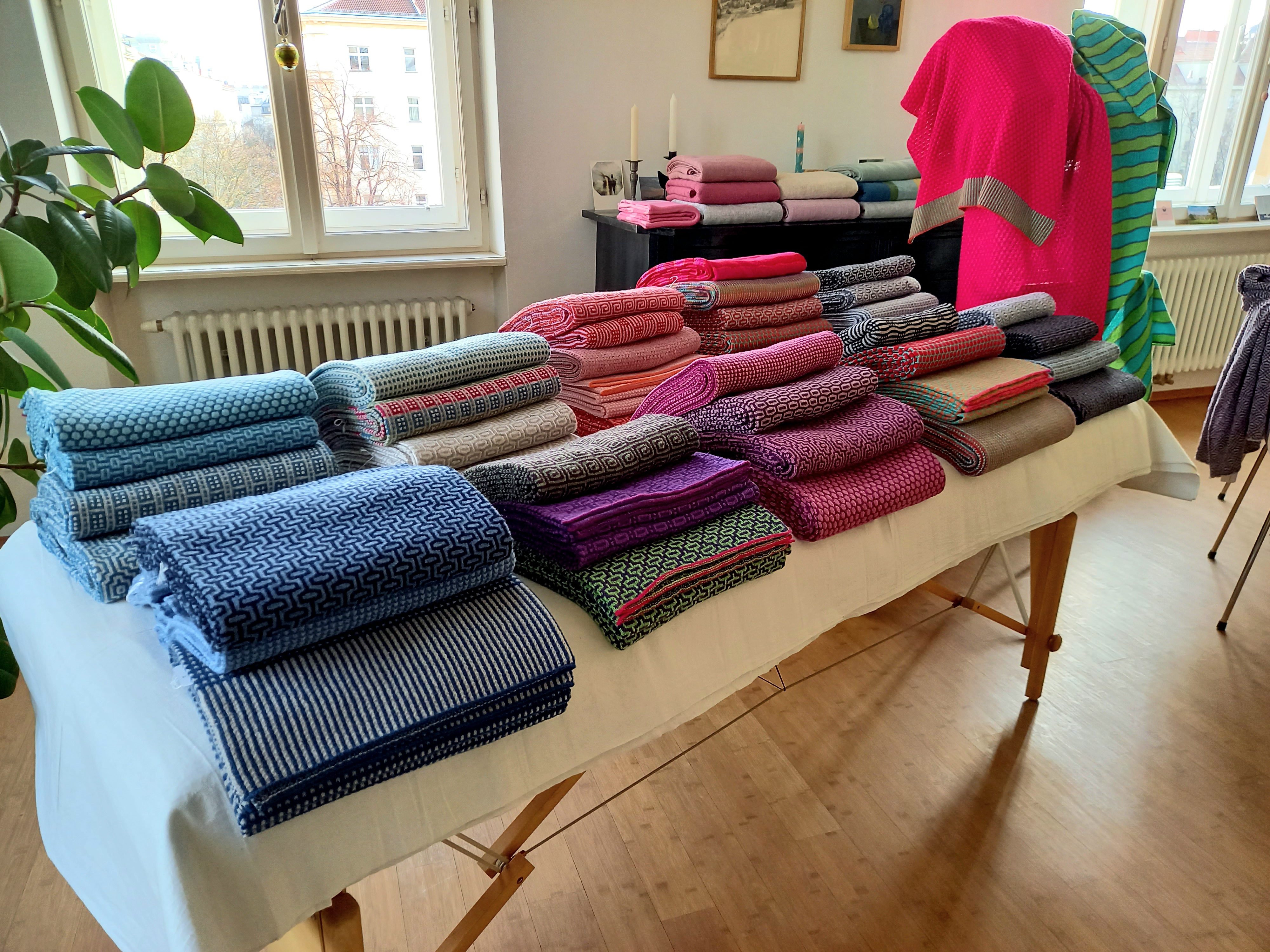 Schals/Tücher, meist zweifarbig, aus 70 % Merino extra fein und 30 % Kaschmir, gestrickt in Fangtechnik auf einem Brother KH 940 Handstrickapparat. Die Größe der Schals variiert je nach Muster zwischen 55 x 180 cm und 65 x 200 cm.