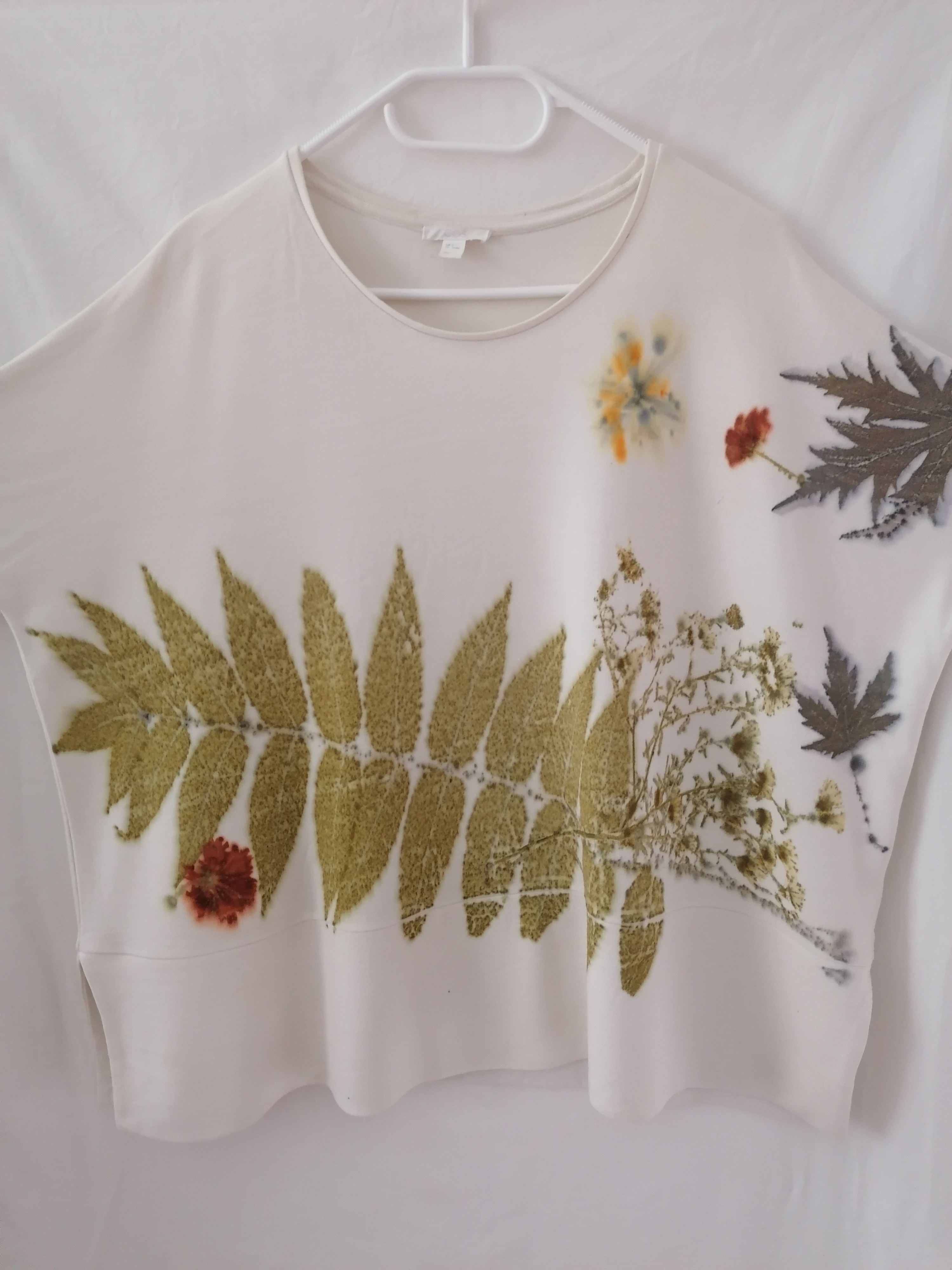 Ich upcycle secondhand Kleidung mit Pflanzendruck, ohne Zusatz von Druckfarben. Dieser ECOPRINT macht aus Blusen, Kleidern und Hosen wunderschöne, natürliche Unikate.
